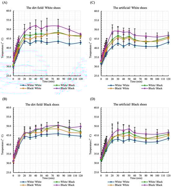 Temperature on the shin surface. Measurements were taken by a temperature sensor attached to the anterior shin surface of mannequins for 120 min under the blazing heat. As indicated in the Methods, the measurements were conducted on different days for the dirt field (A,B) and the artificial turf (C,D). The time-course results obtained in mannequins wearing a white shoe (A,C) and a black shoe (B,D) are expressed as means ± standard deviations. The colors of foot and legwear items are shown in the order of sock/baseball stirrup sock.