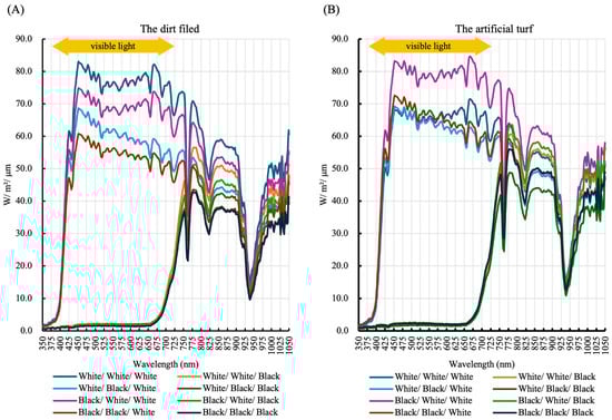 Reflectance spectra were measured using a portable spectroradiometer (#MS-720, EKO Instruments Co., Tokyo, Japan). Eight mannequins wearing shoes, socks, and baseball stockings were placed in the test field, and three independent experiments were conducted on both a dirt field and artificial turf. Measurements were taken over a wavelength range of 350–1050 nm, recording the spectrum of light reflected from baseball stirrup socks illuminated perpendicularly from the front. The sensor was positioned 10 cm from the measurement area using an attachment with a 45° aperture angle. Data collection and analysis were performed using the instrument’s supplied software. The data is one of the three results obtained from experiments conducted on each field type, presented here as a typical example (or a representative instance).