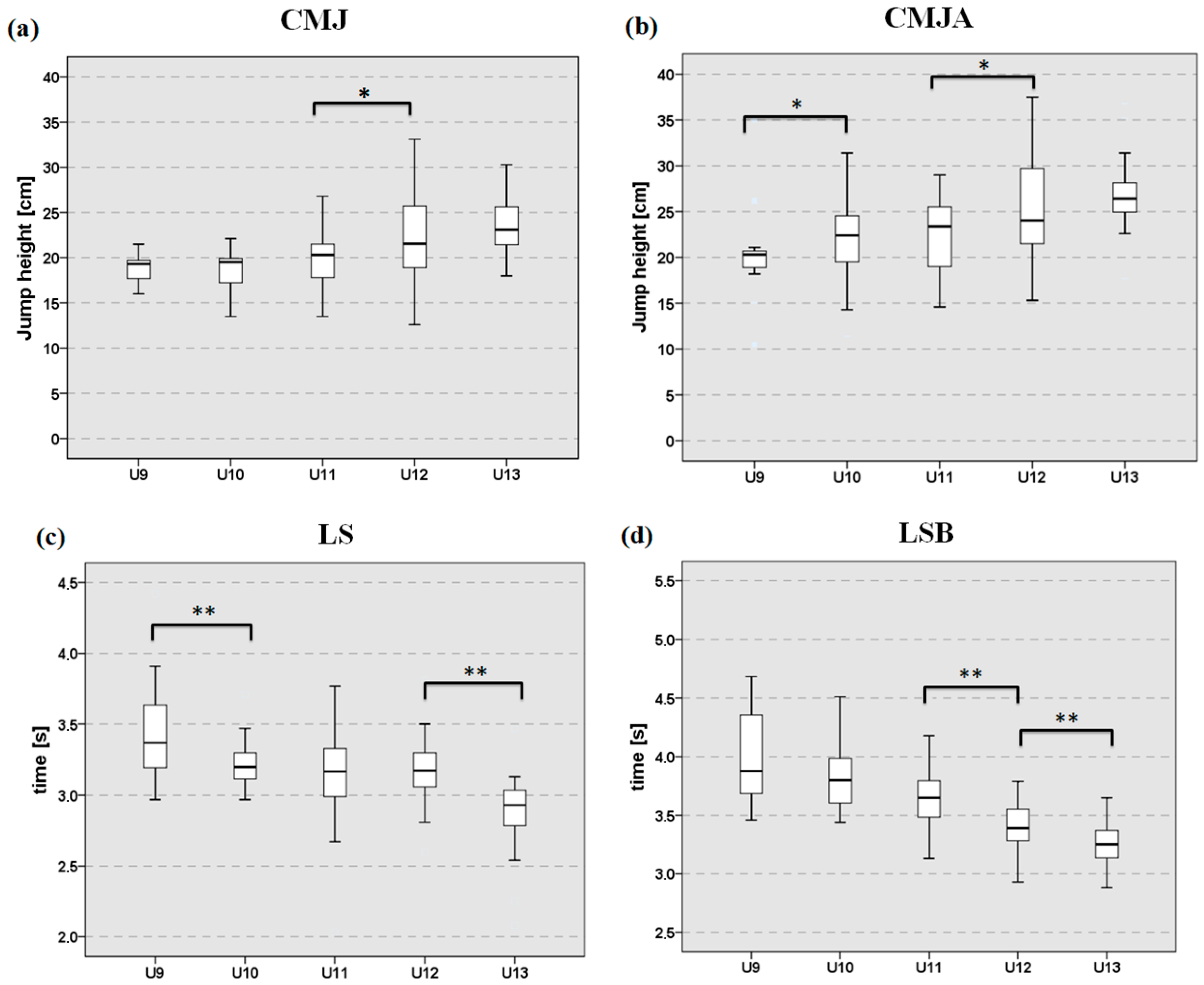 CMJ = Countermovement Jump; CMJA = Countermovement Jump with arm swing; LS = Linear Sprint; LSB = Linear Sprint with ball; AT = Agility test; ATB = Agility test with ball; SeR = Sit and Reach. * p ≤ 0.05 compared to the subsequent older age category.