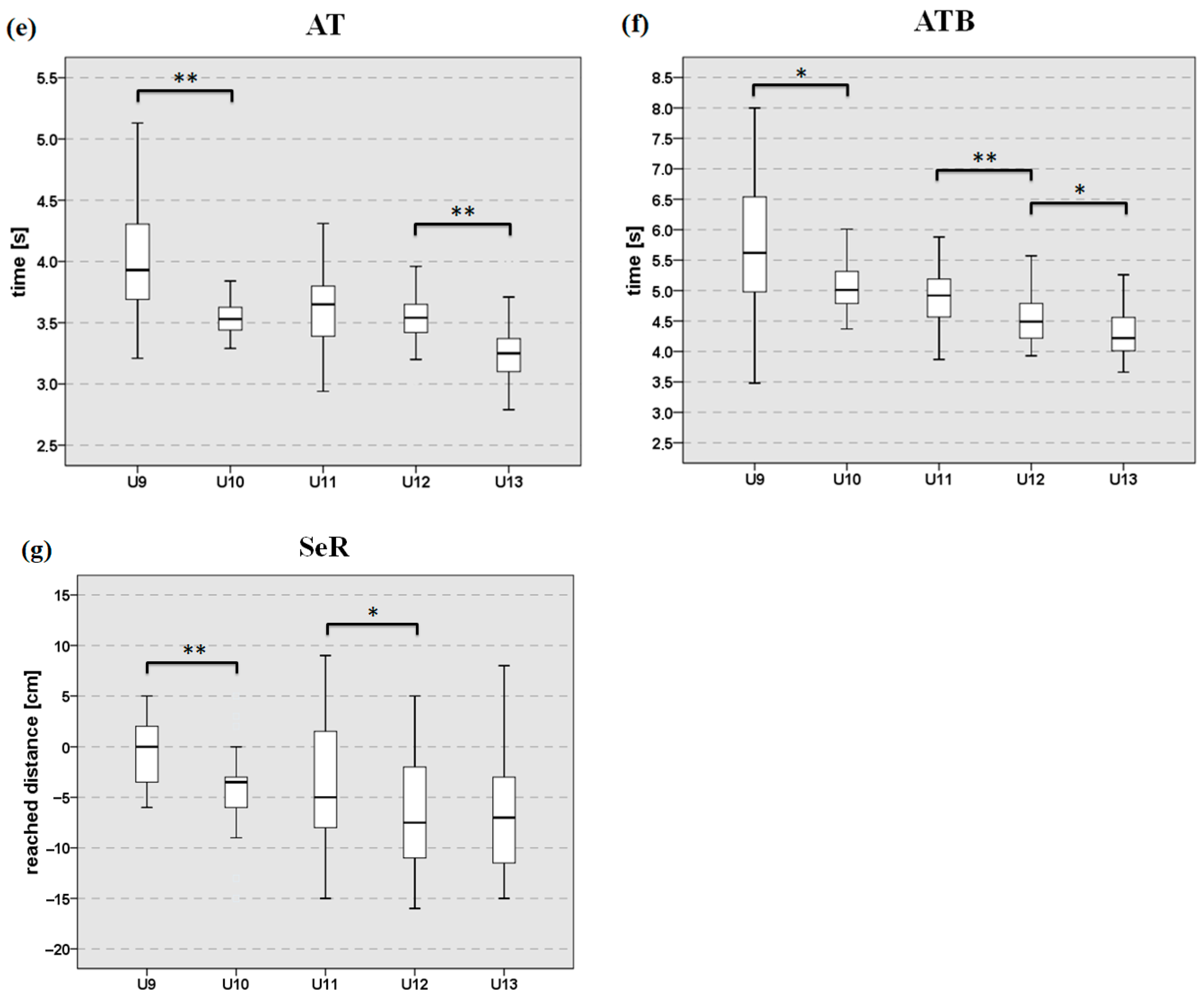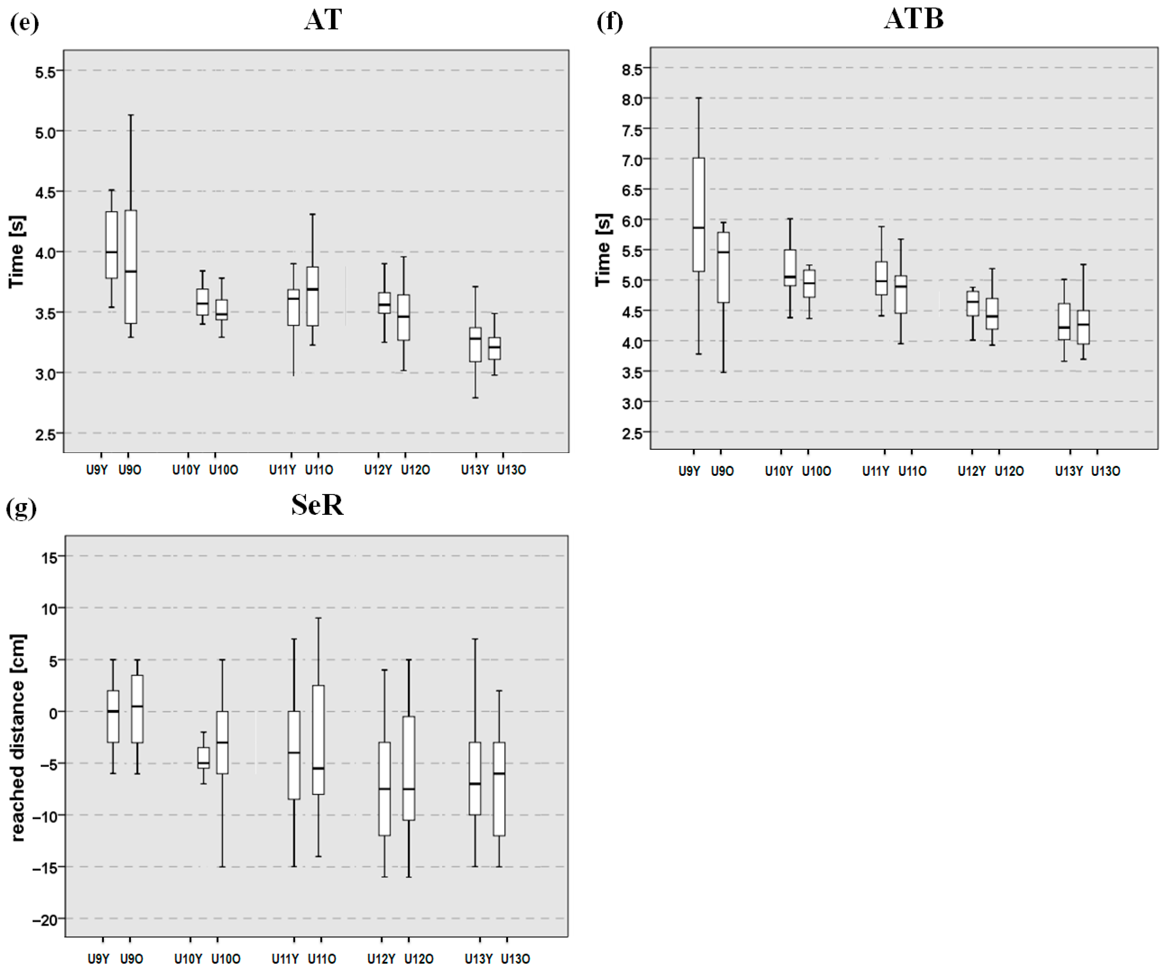 Since significant differences between younger and older athletes could be expected due to athletes’ growth, the post hoc analysis by the non-parametric Mann–Whitney U test was employed to determine whether differences existed only between adjacent age categories (U9 vs. U10, U10 vs. U11, U11 vs. U12, U12 vs. U13). To investigate differences within the same age category, the Kruskal–Wallis test for independent samples was used to assess differences among all subgroups. For parameters showing significant differences, post hoc comparisons between subgroups (Y vs. O) within each age category (e.g., U9Y vs. U9O, U10Y vs. U10O, etc.) were conducted using the Mann–Whitney U test. Statistical significance was set at p ≤ 0.05. The same statistical procedure was then applied to detect significant differences between the subgroups classified according to birth quarter.