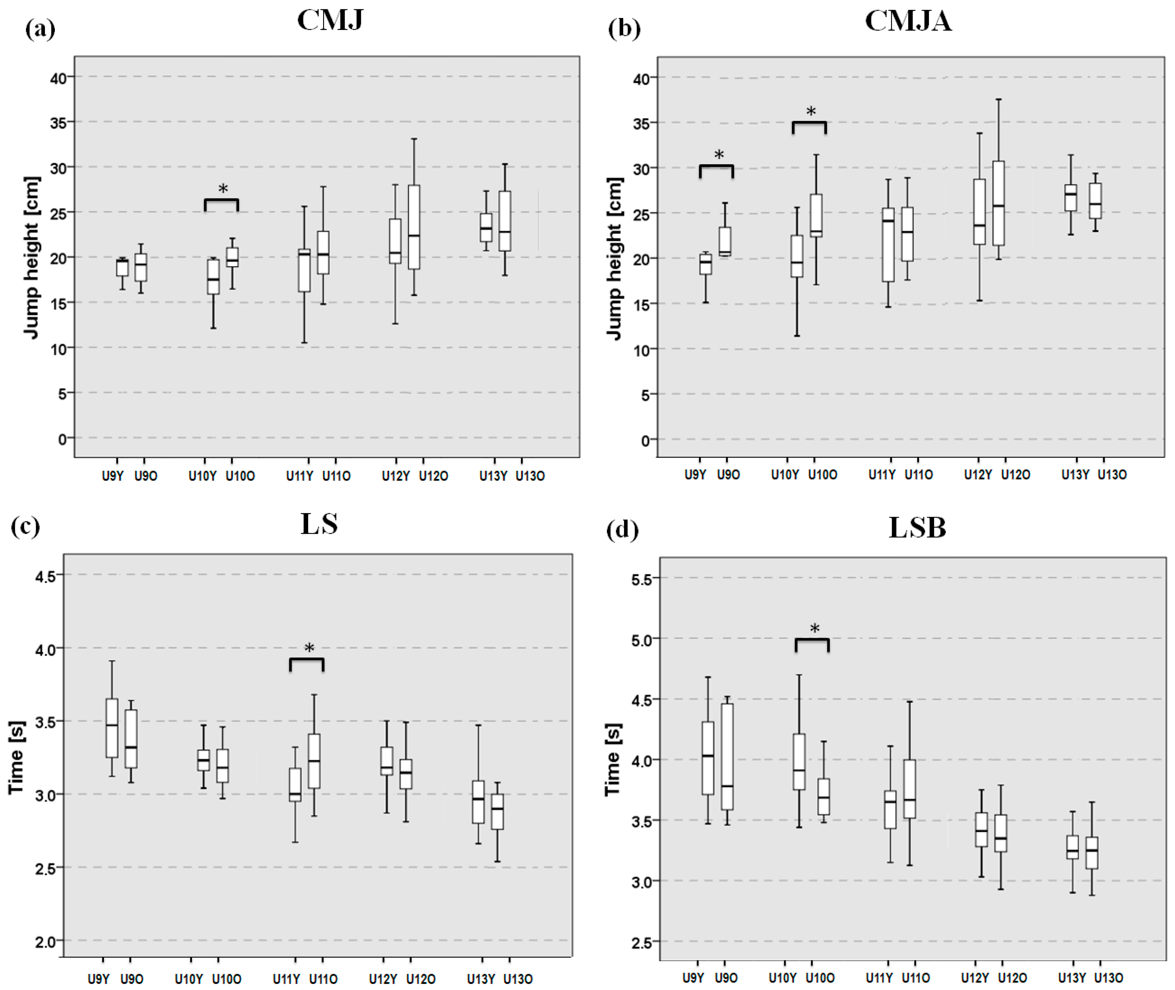 CMJ = Countermovement Jump; CMJA = Countermovement Jump with arm swing; LS = Linear Sprint; LSB = Linear Sprint with ball; AT = Agility test; ATB = Agility test with ball; SeR = Sit and Reach. Subgroup Y is younger than subgroup O. * p ≤ 0.05 compared to the corresponding subgroup of the same age category.