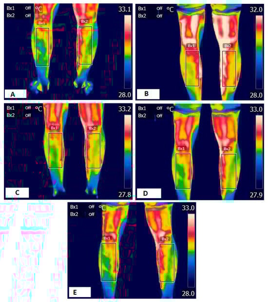 Thermographic sequence. (A) Basal thermography, (B) thermography 25%, (C) thermography 50%, (D) thermography 75%, and (E) final thermography, BX1: left leg; BX2: right leg.