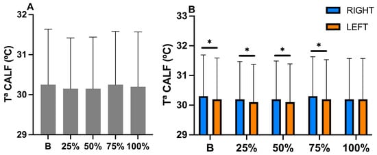 (A) Changes in calf temperature considering only time data during exercise until exhaustion. (B) Changes in calf temperature considering the interaction of time x side during exercise until exhaustion. * = significant differences between right and left side ≤ p = 0.05. Ta = temperature.