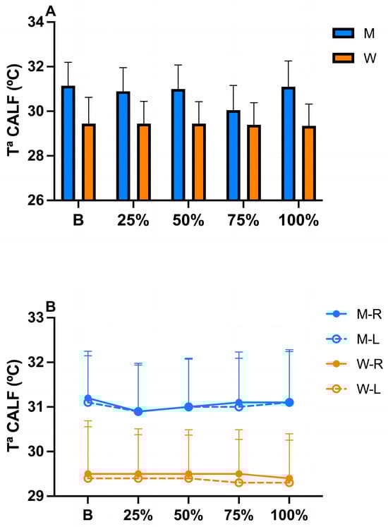 The men’s baseline skin temperature values (right and left calf) were consistently higher than the women’s (29.5 ± 1.19 °C, right; 29.4 ± 1.16 °C, left) (31.2 ± 1.05 °C, right; 31.1 ± 1.05 °C, left, respectively). Throughout the various protocol intensities (25%, 50%, 75%, and 100% of total effort), this sex-related difference of roughly 1.5–1.7 °C remained constant. Women displayed somewhat lower values of ~29.3–29.5 °C throughout all stages, whereas men maintained constant values of about 31.0–31.1 °C.