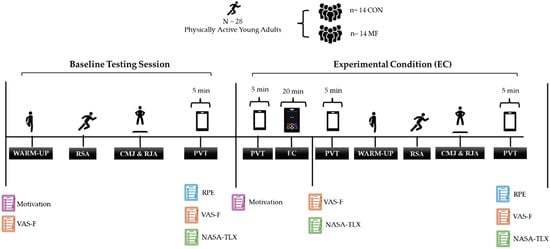During the testing session, participants rated their motivation to complete the whole testing session, completed the M-VAS for mental fatigue, engaged in a standardized warm-up (15 min, including running at a low-to-moderate intensity and dynamic stretching exercises), and performed the RSA test. The multi-directional RSA test protocol involved ten 30 m sprints with multiple changes of direction (6 × 5 m) and 30 s of passive recovery between each sprint, following procedures used in prior studies [,]. At completion, they rated their RPE. For the RSA analysis, performance metrics were defined as follows: the best time (BT) referred to the fastest sprint recorded, the mean time the average of all 10 sprints, and the total time (TT) the cumulative duration of all sprints. The coefficient of variation (CV, %) was calculated as the ratio of the standard deviation to the mean, and the decrement score (Sdec) [,] was also analyzed. The percentage decrement score (Sdec) was utilized as a reliable and valid method for quantifying fatigue during RSA tests [,]. Sprint times were measured with an accuracy of 0.01 s using infrared photoelectric gates (Microgate, Bolzano, Italy), consistent with prior research methodologies []. Afterwards, participants were provided with clear instructions on performing the CMJ without using an arm swing. During the procedure, participants were required to maintain a standing position with their hands placed on their hips, perform a countermovement to a self-selected depth, and jump as high as possible when ready. Each participant performed three maximal-effort CMJs, with a two-minute recovery period between attempts. For analysis, the highest recorded jump was selected, aligning with methods employed in previous research [,,]. Jump heights were recorded using a smartphone and subsequently analyzed using the My Jump 2 application. Afterwards, upon hearing a verbal cue, they performed repeated vertical jumps for 15 s, aiming for maximum height while ensuring simultaneous landing with both feet after each jump. Participants were instructed to “jump as high as possible during the 15-s maximal jump test,” following the protocol established by Del Coso et al. []. All participants were carefully supervised to ensure identical posture and execution, including hands placed on the hips, upright trunk alignment, and avoidance of arm swing, thereby maintaining consistency across trials. The test employed a CMJ technique without the use of upper limbs, as outlined by Hespanhol et al. []. Participants performed each jump with an approximate knee flexion angle of 110°, which has been identified as optimal for maximizing strength application [,]. Continuous vertical jumps were performed at maximal effort, with no pauses between repetitions. To ensure accuracy and consistency, participants were instructed to maintain a vertical trunk position, minimize forward motion, and fully extend their knees during the flight phase of each jump. The average vertical jump height over the 15 s interval was calculated, in line with methods validated in prior studies [,]. At completion, they rated their RPE and completed the NASA TLX scales and M-VAS. Afterwards, they performed a 5 min PVT using SOMA NPT (Lucerne, Switzerland) to assess vigilance to perform. Next, they completed one of two 30 min experimental conditions while sitting comfortably in a quiet, dimly lit room. In the MF condition, they performed an incongruent Stroop color–word task using a tablet running the SOMA-NPT app (Switch, Lucerne, Switzerland). In the control condition (CON), they watched an emotionally neutral documentary about cars on the same screen []. At the end of each condition, they completed again the National Aeronautics and Space Administration Task Load Index (NASA-TLX), performed a 5 min PVT, and rated their MF. Afterwards, they repeated the battery of physical tests again (RSA, CMJ, RJA), filled out the questionnaire, and completed another 5 min PVT.