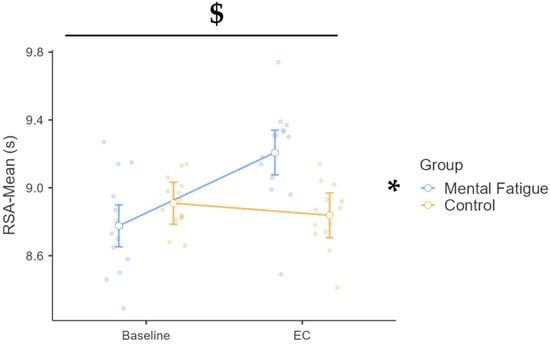 A significant time × group interaction was observed, F(1, 26) = 21.73, p < 0.001, η2p = 0.455, 90% CI [0.20, 0.61], with the RSA-Mean increasing from baseline to EC in the MF group but not in the CON group (Figure 2). The MF group showed a large increase (Δ = 0.432 s, p < 0.001, d = 1.86, 95% CI [0.67, 3.05]), while the CON group showed no change (Δ = 0.071 s, p = 1.000, d = 0.31, 95% CI [−0.64, 1.25]). At EC, MF was significantly slower than CON (Δ = 0.370 s, p = 0.002, d = 1.59, 95% CI [0.31, 2.87]). A main effect of time was also significant, F(1, 26) = 11.15, p = 0.003, η2p = 0.300, 90% CI [0.07, 0.48], but no baseline group difference was found, F(1, 26) = 2.91, p = 0.100, η2p = 0.101.