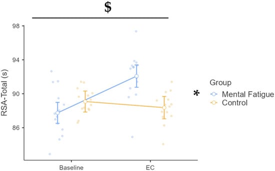 Repeated sprint ability (RSA): total time across phases and groups. Note: RSA-Total Time (mean ± SE) for the mental fatigue and control groups across sessions (pre vs. post). Symbols denote statistical significance: $ = group × session interaction (p < 0.05); * = main effect of session (time), (p < 0.05).