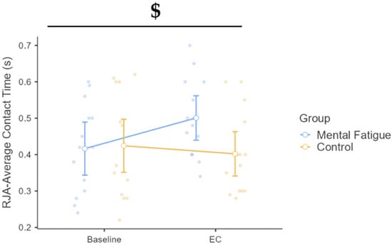 Repeated jump ability (RJA): average contact time across phases and groups. Note: RJA-Average Contact Time (mean ± SE) for the mental fatigue and control groups across sessions (pre vs. post). $ = significant group × session interaction. RJA-Average Contact Time: a significant group × session interaction ($ p < 0.05) was identified.
