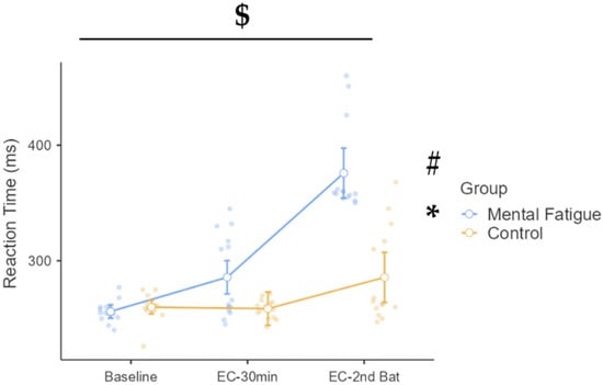 Psychomotor vigilance task: reaction time (RT) across phases and groups. Note: RT (mean ± SE) of reaction time (RT, in milliseconds) measured using the psychomotor vigilance task (PVT) for the mental fatigue and control groups across three time points: baseline, EC–30 min (after 30 min of the executive control task), and EC–2nd Battery (after completion of the second battery of physical/cognitive tasks). $ = significant group × session interaction; * = significant main effect of session (time); # = significant main effect of group (condition). RT: a significant group × session interaction ($ p < 0.05), a significant main effect of session (* p < 0.05), and a significant main effect of group (# p < 0.05) were identified.