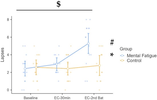 Psychomotor vigilance task: number of lapses across phases and groups. Note: Lapses (mean ± SE) recorded in the psychomotor vigilance task (PVT) for the mental fatigue and control groups across three time points: baseline, EC–30 min (after 30 min of the executive control task), and EC–2nd Battery (after completion of the second battery of physical/cognitive tasks). $ = significant group × session interaction; * = significant main effect of session (time); # = significant main effect of group (condition). Lapses: A significant group × session interaction ($ p < 0.05), a significant main effect of session (* p < 0.05), and a significant main effect of group (# p < 0.05) were identified.