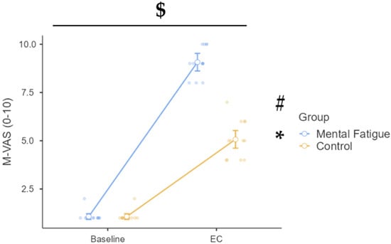 Mental Visual Analog Scale (M-VAS) across phases (baseline and EC) and groups. Note: M-VAS (mean ± SE) for the mental fatigue and control groups across sessions, baseline and EC (after completion of the second battery of physical/cognitive tasks). $ = significant group × session interaction; * = significant main effect of session (time); # = significant main effect of group (condition). M-VAS: a significant group × session interaction ($ p < 0.05), a significant main effect of session (* p < 0.05), and a significant main effect of group (# p < 0.05) were identified.
