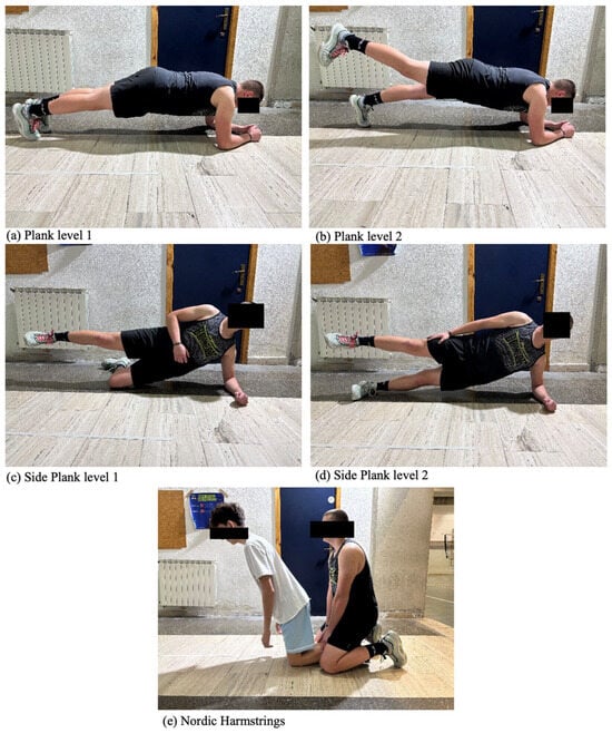 Core training exercises. The figure shows pictures of the Participant performing each exercise of the core training protocol: (a) Plank level 1; (b) plank level 2; (c) side plank level 1; (d) side plank level 2; (e) Nordic hamstring.