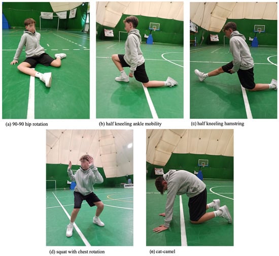 Mobility training, frequently mischaracterized as solely preventative, is increasingly recognized as a critical component of performance optimization. Mobility is not only related to joint range of motion but also gives information about neuromuscular control throughout that range under dynamic conditions []. Cook and colleagues demonstrated that exercises such as the deep squat are a predictive tool for evaluating the functional mobility of the hips, ankles, and shoulders, while also assessing motor control and core stability []. Limited joint mobility, particularly in the hips, shoulders, and ankles, has been associated with dysfunctional movement patterns, elevated injury risk, and decreased power output []. Enhancing mobility facilitates access to biomechanically advantageous positions, improves movement efficiency, and supports the execution of sport-specific skills such as the defensive stance or triple-threat position []. Mobility training, particularly focusing on the hips, has been shown to directly enhance functional range of motion and transfer to improvements in agility and sprint times in high school basketball players []. On the other hand, there are currently no studies linking hip mobility training with improved dynamic balance in young basketball players.