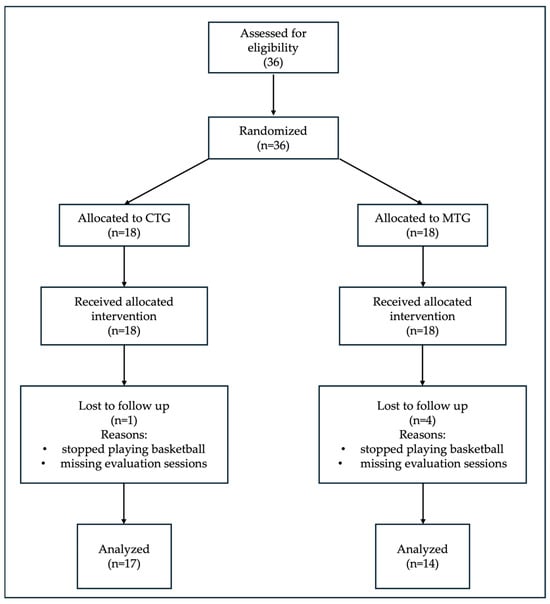 Five participants were excluded from data analysis because they had stopped practicing basketball and did not participate in the evaluation sessions. Thirty-one participants (age: 14.8 ± 2.04 years, weight: 70 ± 11.8 kg, BMI: 22.9 ± 3.07 kg·m−2) completed both the T0 and T1 evaluations and were included in the data analysis, comprising CTG (n = 17) and MTG (n = 14). The overall mean training sessions adherence was 86.96 ± 10.02%. Table S1 (Supplementary Materials) reports adherence for each participant as the percentage of sessions attended. The participant flow through the study is summarized in the CONSORT diagram (Figure 3).