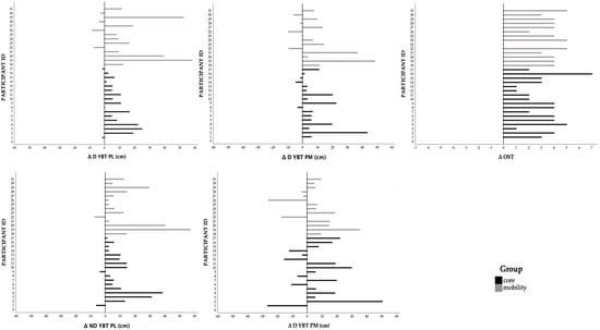 The results demonstrated strong methodological convergence, identified significant time effects from T0 to T1 for YBT ND PM (mixed ANOVA: p < 0.001, LMM: p = 0.002), YBT ND PM (both p < 0.001), YBT D PM (mixed ANOVA: p = 0.001, LMM: p = 0.014), YBT D PL (both p < 0.001), and OST (LMM: p < 0.001; mixed ANOVA: p < 0.001). All methods agreed on the lack of significant time × group interactions (all p > 0.50). All approaches consistently found no improvements in hop tests, static balance, or flexibility. The Agility T-Test and the 6 m hop test showed methodological dependence, with significant improvement in ANOVA (p = 0.002) but not in LMM (p = 0.114). The 6 m timed hop approached was significant in ANOVA (p = 0.042) but not in LMM (p = 0.342) Figure 4 shows individual variation for the variable, resulting in statistically significant improvements in all methods.