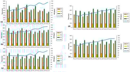 Choice reaction (CR) and heart rate (HR). CR followed a similar trend (Table 5), with S1 decreasing substantially (m = 687.8, SD = 76.02 ms to m = 500.8, SD = 38.80 ms), resulting in a −27.18% reduction in post-test. The HR was increased from m = 124.9, SD = 26.4 to m = 141.4, SD = 28.5 bpm (8.85%). CR improvements were also evident in S3 (−13.37%), with improvements in HR (9.6%) and S5 (−12.66%), as well as HR (2.39%) in the post-test. Conversely, CR in S2 (0.53%), with a HR (1.35%), and S4 (1.25%), HR (1.5%) showed negligible increases.