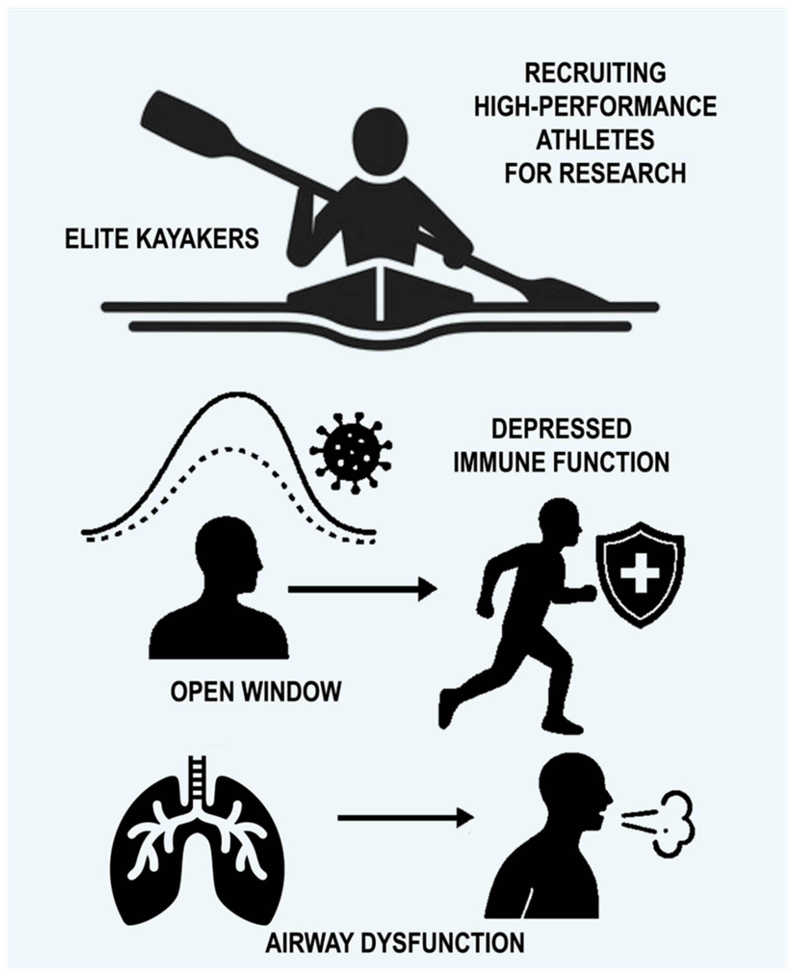 - Bougault, V.; Adami, P.E.; Sewry, N.; Fitch, K.; Carlsten, C.; Villiger, B.; Schwellnus, M.; Schobersberger, W. Environmental factors associated with non-infective acute respiratory illness in athletes: A systematic review by a subgroup of the IOC consensus group on “acute respiratory illness in the athlete”. J. Sci. Med. Sport 2022, 25, 466–473. [Google Scholar] [CrossRef]
