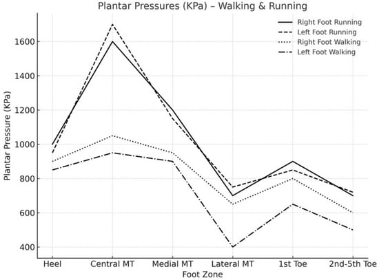 During ambulation, both walking and running, the greatest peak pressures were recorded at the central metatarsal heads, followed by the first metatarsal and the heel. Differences between the left and right feet were assessed using paired statistical tests, as reported in Table 3. No statistically significant differences were observed in any of the plantar regions during walking or running. The values presented denote the average peak plantar pressures recorded per step, aggregated across all measured anatomical regions, as opposed to representing cumulative or continuous loads over multiple steps. Table 3 provides a summary of the pressures recorded in the six anatomical areas corresponding to the right and left feet under both walking and running conditions. The same pattern of plantar pressure distribution was evident during both walking and running (Figure 2). When walking, the right foot exerted 13–60% more pressure on the outer metatarsal and toe areas. The left foot experienced up to 13% more pressure in the middle metatarsal area. During running, the pressure difference between the feet ranged from −8% to +19%. The right foot usually had more pressure on the heel and first toe