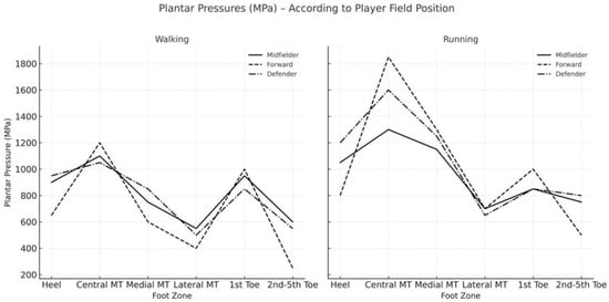 The analysis of data pertaining to plantar pressure distribution relative to line-up position on the field yielded noteworthy findings (Figure 4). Under walking conditions, the most significant differences were observed between midfielders and forwards. Forwards exhibited increased plantar pressures in the central metatarsal region and reduced pressure in the medial and lateral metatarsal areas, as well as at the small toes. In contrast, midfielders demonstrated the highest pressure in the medial metatarsal area. During running, forwards showed the greatest increase in pressure in both the central and medial metatarsal regions (Figure 5). Defenders experienced higher increments in heel pressure and a reduction in pressure at the first toe (Figure 6).