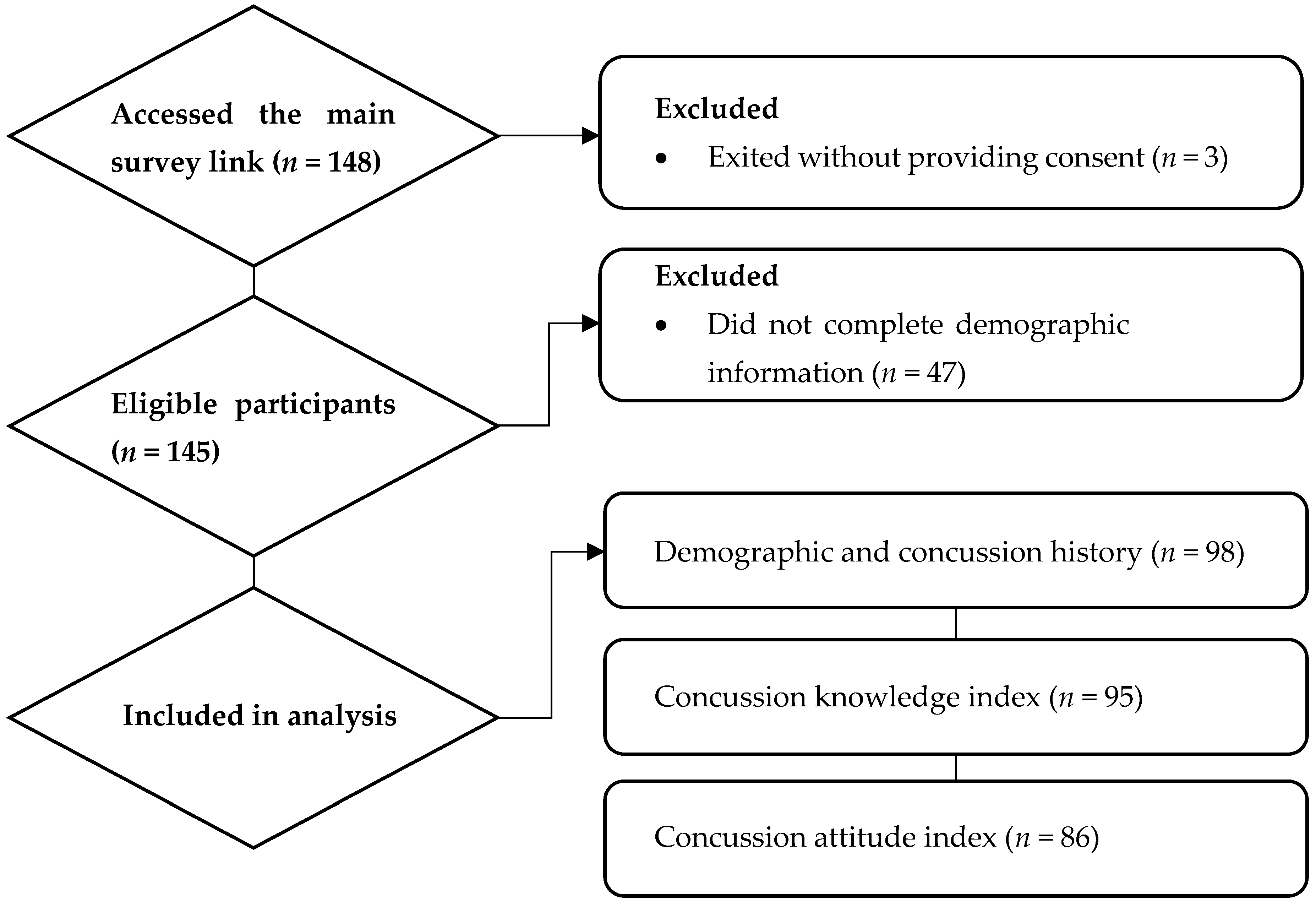 - Taylor, M.E.; Sanner, J.E. The Relationship Between Concussion Knowledge and the High School Athlete’s Intention to Report Traumatic Brain Injury Symptoms. J. Sch. Nurs. 2017, 33, 73–81. [Google Scholar] [CrossRef] [PubMed]