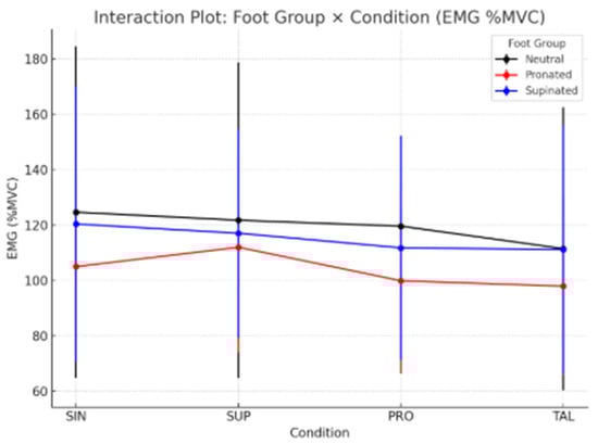 The interaction plot (Figure 2) shows distinct EMG response patterns across foot groups and conditions. Ng (black line) and SPg (blue line) exhibited a progressive reduction in EMG activity from SIN to TAL, while the PRg (red line) showed a slight increase under the SUP condition followed by a decrease, suggesting different adaptation mechanisms among foot types.