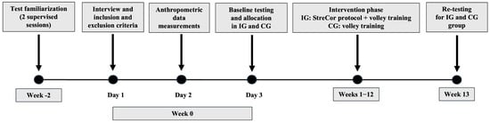The study was conducted at the gym of the volleyball club where the athletes were recruited. In the first phase, on three non-consecutive days within one week, the participants did not engage in any training sessions or competitive matches (see timeline of the study design in Figure 1). On the first day, inclusion and exclusion criteria were verified for each participant through a structured interview. On the second day, anthropometric data, including body weight, height, and lower limb length, were collected. On the third day, following a standardized warm-up protocol (5 min jogging at a self-selected comfortable pace), participants completed a series of PP tests including: the modified Star Excursion Balance Test (mSEBT), Countermovement Jump (CMJ) and the Athletic Shoulder test I-position (ASH-I), Vertec (V) test with run-up approach, and agility t-test. After evaluation, participants were randomly allocated to either the Intervention Group (IG; n = 12; 5 males and 7 females) or the Control Group (CG n = 9; 6 males and 3 females) using simple randomization. A computer-generated random sequence was created by an investigator who was not involved in participant assessment or training supervision. Group allocation was revealed only after baseline assessments to ensure allocation concealment and reduce the potential risk of selection bias [21].