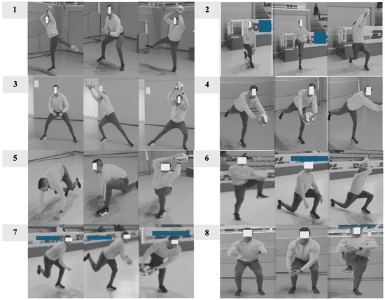 The StretCor protocol was designed to integrate dynamic flexibility and core stability activation in a brief, sport-specific sequence. It consisted of eight exercises performed in succession (seven out of eight with the use of the ball), with 15 s of passive recovery between each, for a total duration of approximately 10 min. The protocol targeted key muscle groups involved in volleyball-specific movements, including the hamstrings, hip flexors, shoulder girdle, and trunk musculature. Each exercise was selected to promote mobility, neuromuscular control, and functional stability in preparation for explosive and multidirectional actions. To provide a progressive overload stimulus, after starting using the volleyball ball for the first four weeks it was replaced with a medicine ball of 2 kg and 3 kg for male, and 1 kg and 2 kg for female athletes, during weeks 5–8 and 9–12 of the intervention protocol, respectively. The sequence visual illustrations and detailed descriptions of the StretCor protocol are provided in Figure 2; detailed descriptions of the exercises are provided in the Supplementary Materials File S1.