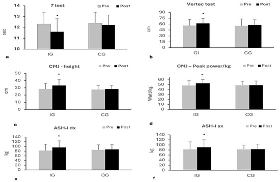 Mean ± standard deviation values for t-test (a), Vertec test (b), CMJ—height (cm) (c), CMJ—Peak power/kg (d), ASH-I dx (e), and ASH-I sx (f) in IG and CG in pre- and post-StretCor protocol training. CMJ, Countermovement Jump; ASH-I, Athletic Shoulder test version I. IG, Intervention Group; CG, Control Group. * Significant differences (p < 0.001) compared to pre-StretCor.