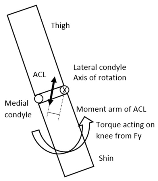 In this landing situation, if the surface is slippery then it significantly affects the load on the knee. In a slippery surface the horizontal component of the GRF is minimal, or if the foot of the athlete slips or slides sideways at contact, this horizontal force component (Fx) can even be zero. However, it must be emphasized that this is a theoretical boundary condition in a simplified model. Experimental data acquisition is required in the future in order to improve it into a more universally usable model. Consequently, if Fx is zero only the vertical component of the gravitational force (Fy) is present. Fy will create—as the Fy can be 5–10 times greater, or more than the gravitational force, (partially because as we have observed in the video recordings, in the cases the knee is in an almost entirely extended position)—a significant torque acting on the knee. This torque will try to rotate the shin around the knee in a clockwise direction (Figure 4). As Fy is significantly greater than G—especially if the knee is in an extended position—the torque originating from the GRF can also be significantly greater acting on the knee. This torque will rotate the shin around the lateral condyle of the knee joint, consequently generating significant load on the ACL. In an extreme situation this biomechanical load can exceed the mechanical tensile strength of the ACL, consequently injury will occur in the ligament [32] (Figure 4 and Figure 5). Nevertheless, we must emphasize three influencing factors. Firstly, torque generation in the human body is not a binary process, although in this model, considering the conservative approach, we have used the maximum values we have found in the literature. Secondly, another aspect we must consider is that this simplified model is not able to take into account the inter-individual variability in ligament properties. Mechanical tensile strength is individually different from person to person; therefore, the tensile threshold used in the calculation to determine injury occurrence is subjective and can be considered as a limitation. Furthermore, neural activation and neuromuscular compensation differ from person to person, which is also an influencing factor in the properties of the active components.