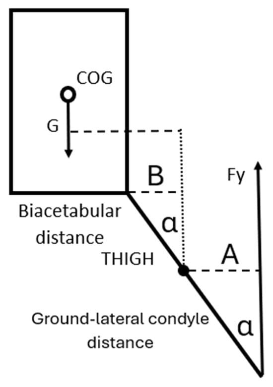 To determine the abduction torque of Fy for the knee, the moment arm is A = Ground-lateral condyle distance ▪ (sinα); the moment arm of G is biacetabular distance/2 + B = biacetabular distance/2 + THIGH ▪ (sinα).