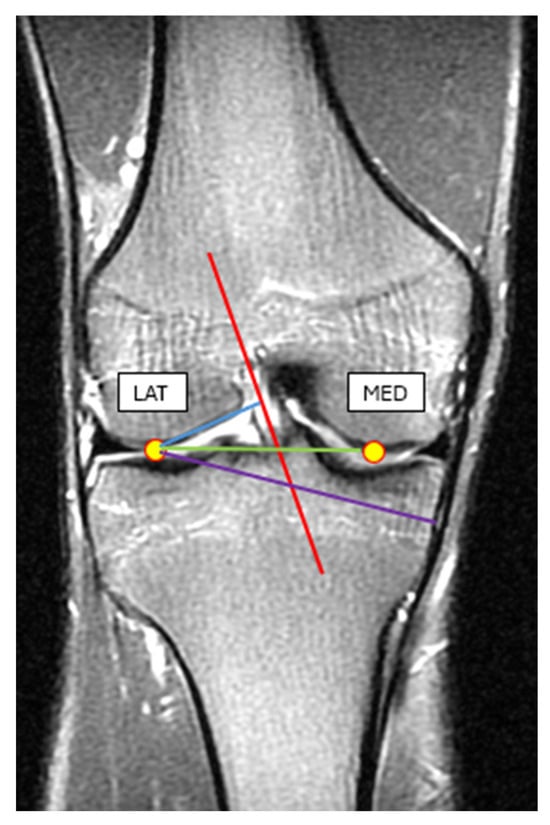 MRI image of the knee in an extended position. Blue line: the lateral condyle–ACL distance, purple line: lateral condyle–MCL distance, green line: lateral condyle–medial condyle distance.