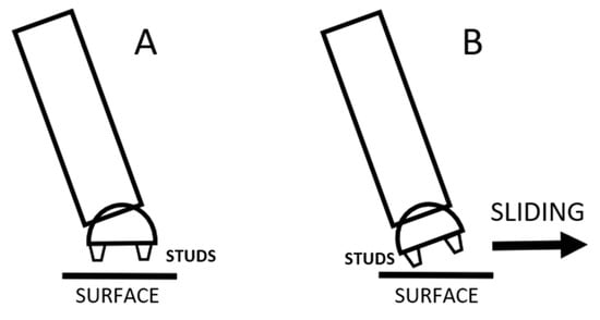 The shin and the foot of the athlete in the frontal plane in the moment of landing, also indicating the position of the studs. In (A), the foot is parallel with the surface and the studs provide adequate grip, while in (B), as the foot is not parallel with the surface, the possibility of sliding of the foot at landing increases.