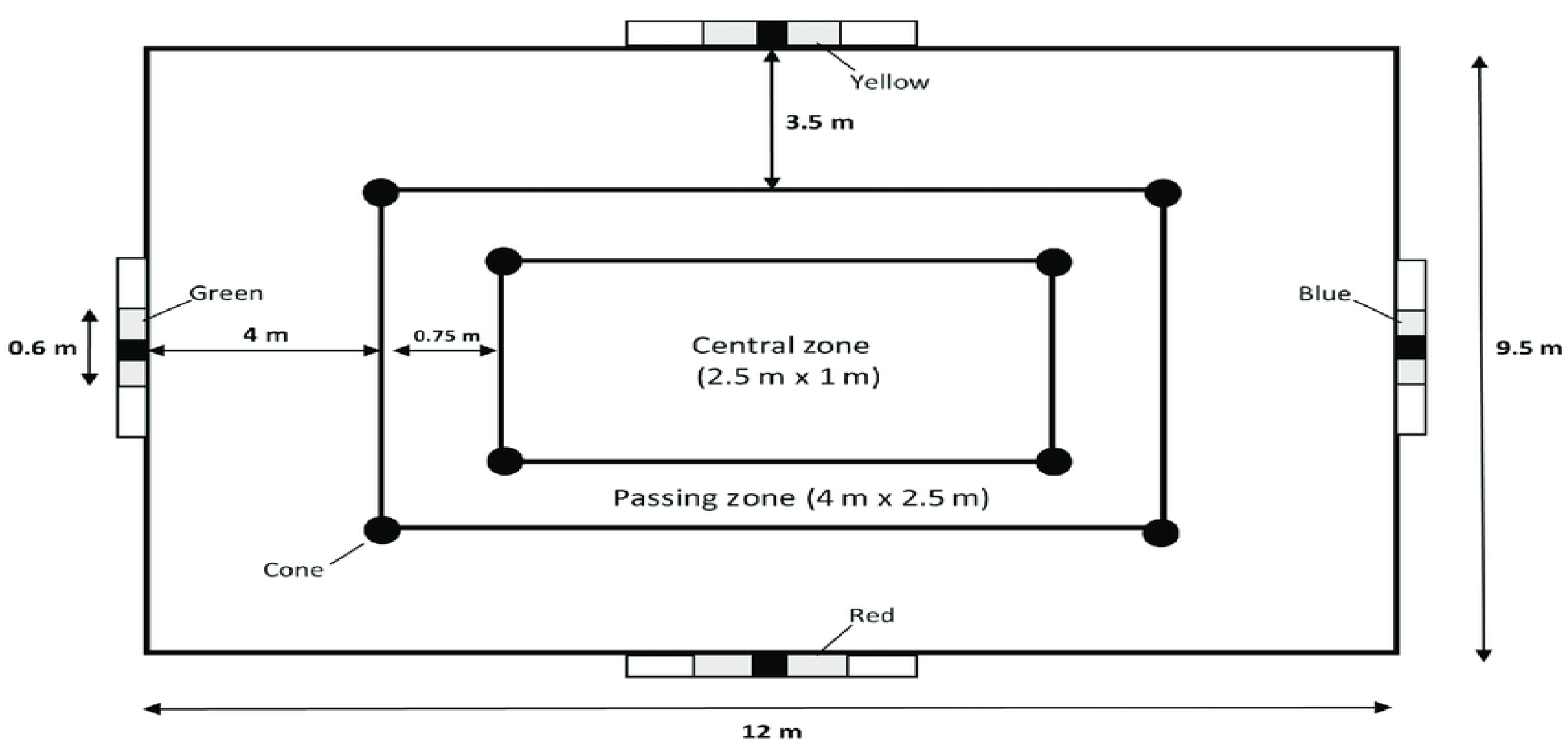 24]. Participants stood in a central zone surrounded by four colored target zones. At the examiner’s verbal cue, they passed the ball toward the named target as quickly and accurately as possible. Of the sixteen passes, eight were shorter (to yellow and red targets), and eight were longer (to green and blue targets), which the examiner called randomly for each participant. After each return, the next command was issued immediately. Performance was timed from start to finish, which means the participants had to complete the sixteen passes as fast as they could in order to submit a better result Time penalties were added to the finishing time of the test for the following: missing the target (three seconds), wrong target (five seconds), touching any cone with the ball or passing from outside the designated zone (two seconds), and exceeding the 43 s standard test duration (one second per second), The final score was the sum of the raw completion time plus penalty time, producing a single performance index where lower scores indicated better performance (