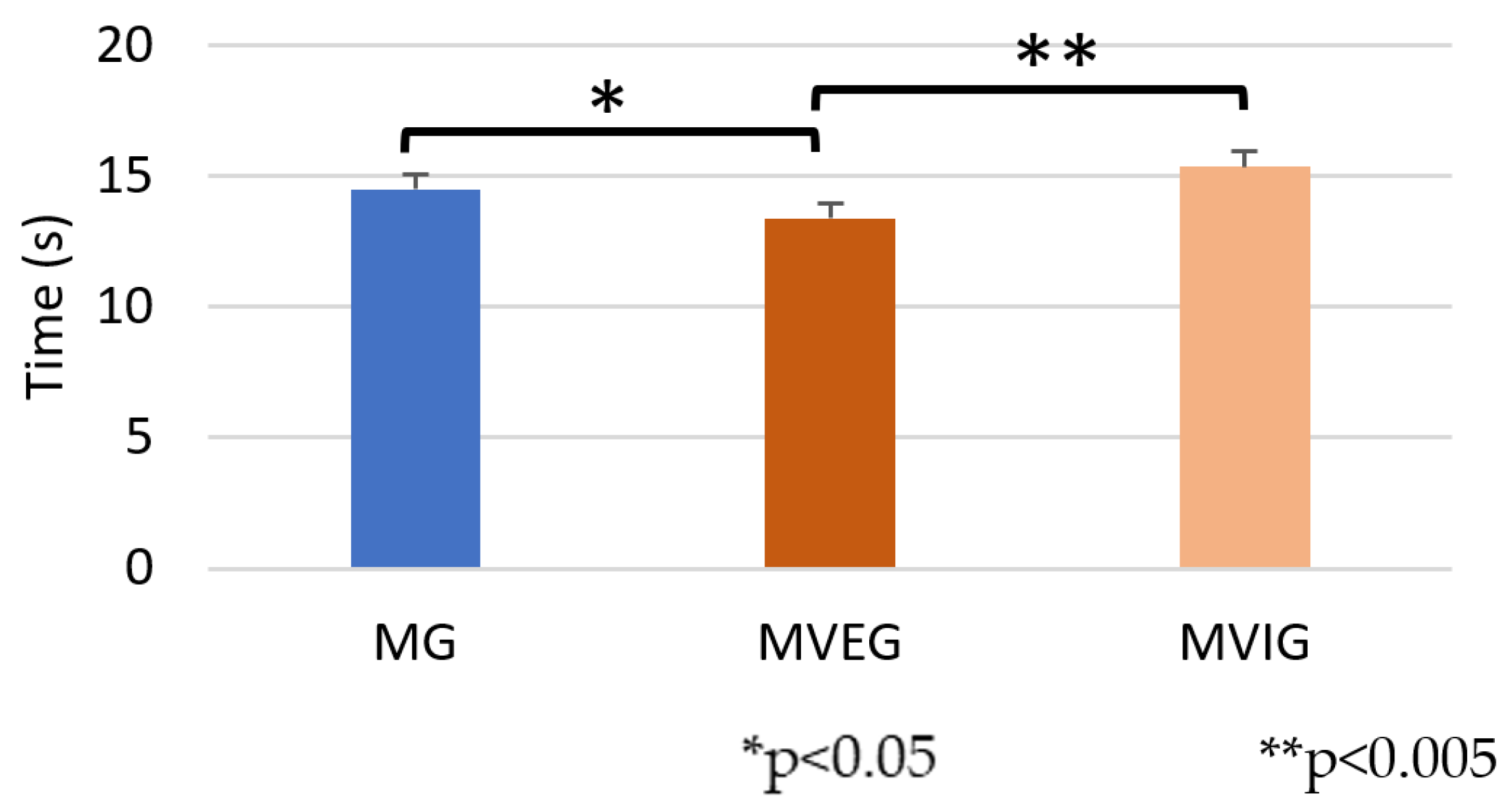 7]. Performance in IBT, a complex agility task involving ball control, direction changes, and spatial awareness, also reflected cognitive benefits. MVEG and MVIG outperformed MG in completion time, likely due to improvements in multi-tasking and attentional control—key components in performing task sequences and executing precise motor actions. Previous research has shown that motor–cognitive interventions can lead to immediate improvements in working memory. Our findings may further support the notion that ball-dribbling agility tasks engage not only physical capacities but also cognitive processes. This dual demand has been documented in earlier studies, reinforcing the view that such tasks reflect the complex interplay between motor execution and cognitive control [