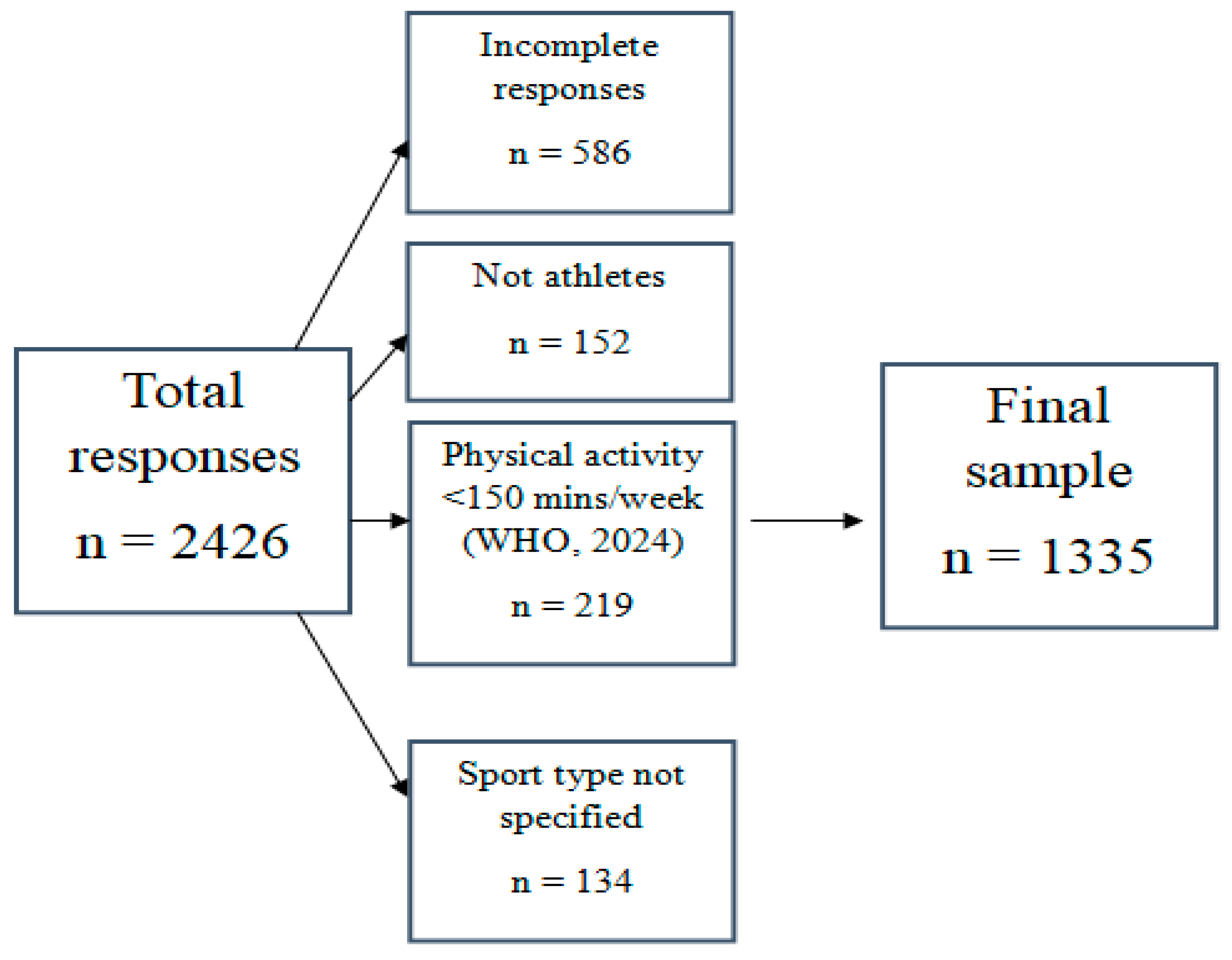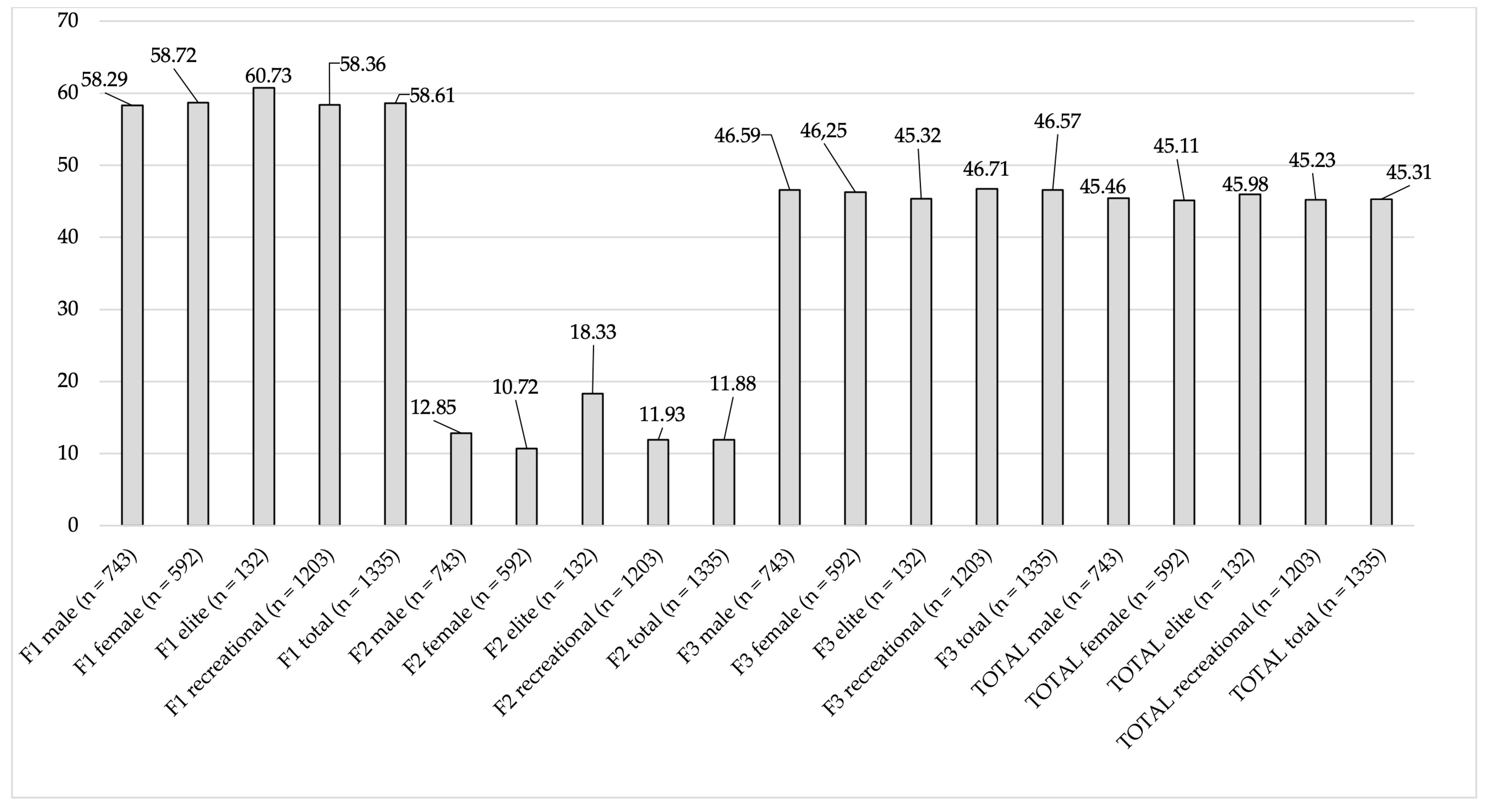 | Sport Discipline | Elite (n = 132) | Recreational (n = 1203) | Total Sample (n = 1335) | ||