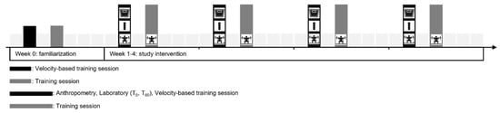This was a monocentric, prospective observational study investigating the acute hormonal response to resistance training in elite female athletes. The resistance training was part of the athletes’ regular training schedule and was not modified or prescribed by the study protocol. All participants engaged in resistance training twice a week over a four-week period, with laboratory assessments performed once a week, both before and after training (Figure 1). A one-week familiarization phase preceded the intervention to ensure the standardization of testing procedures and the execution of training. The sample size was estimated based on the sample sizes reported in comparable studies [14,50,68] and an assumption regarding the expected testosterone response, which is subject to uncertainty. Specifically, we assumed that an average increase of 1.25 nmol/L from a baseline of 2.5 nmol/L (Cohen’s d ≈ 0.5) would represent a meaningful effect. Based on these calculations, a total of 34 paired pre- and post-training measurements was considered adequate to detect a statistically significant difference at a level of 0.05 with 80% power. Although the power calculation was based on testosterone due to the availability of reference data, DHEA was defined a priori as the primary endpoint according to the approved ethics protocol.