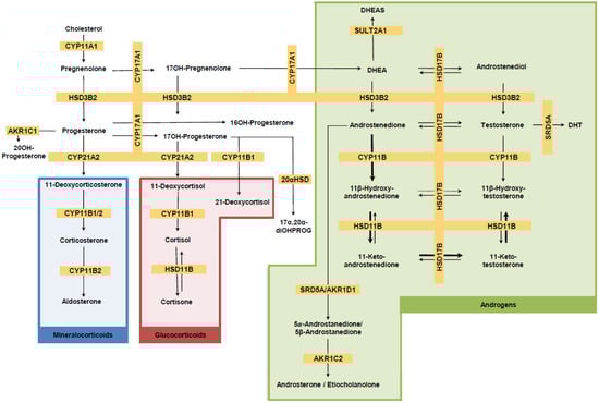 - Auchus, R.J. Overview of Dehydroepiandrosterone Biosynthesis. Semin. Reprod. Med. 2004, 22, 281–288. [Google Scholar] [CrossRef]