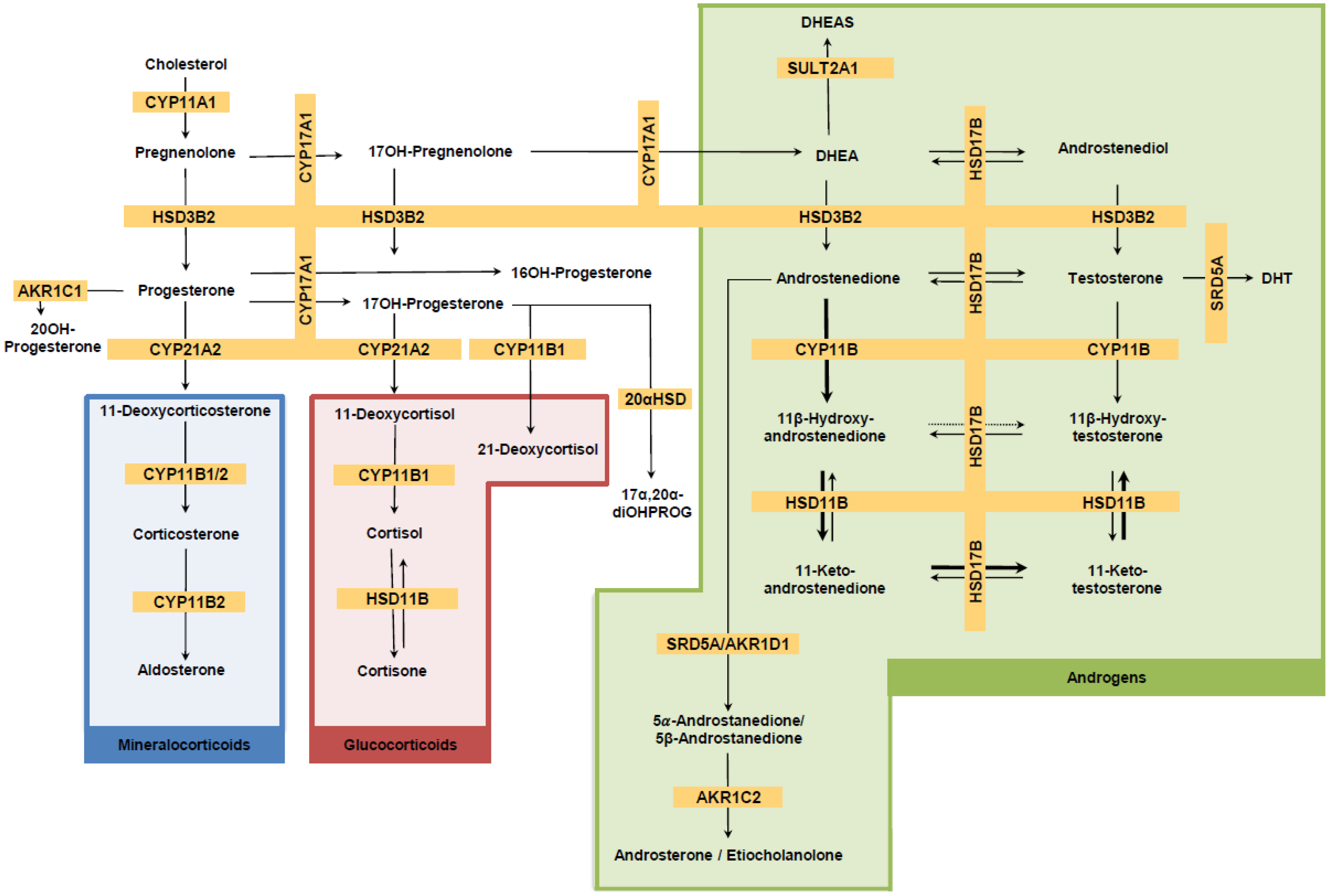 | Metabolite | Androgens (Exclusively Adrenal Androgens Marked by xx) | Miner- Alocorti-coids | Gluco- Corticoids | Progestins, Unclassifiable Steroids | Classical Pathway | 11-oxy Pathway | 11-oxy- Pathway and Its Direct Precursors | Backdoor Pathway |
