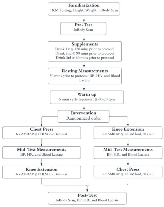 Experimental Design. 1 RM: 1-repetition maximum testing, BP: blood pressure, HR: heart rate, AMRAP: as many repetitions as possible (until failure), 12 RM: calculated 12-repetition maximum load used as the testing load.