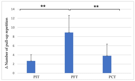 Between-group differences in PU repetition improvements after the 8-week intervention. ** p < 0.01. (PU = pull-up repetitions; PIT = pull-up + interval training; PFT = pull-up + forearm training; PCT = pull-up + core training; Δ = pre–post change).