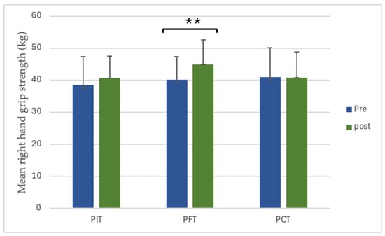 The value of pre- and post-training right-hand grip strength. ** p < 0.01. (PIT = pull-up + interval training; PFT = pull-up + forearm training; PCT = pull-up + core training; kg = kilograms).