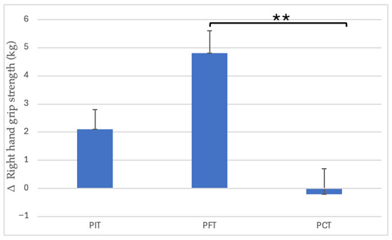 Between-group differences in right-hand grip strength improvements. ** p < 0.01. (PIT = pull-up + interval training; PFT = pull-up + forearm training; PCT = pull-up + core training; kg = kilograms; Δ = pre–post change).