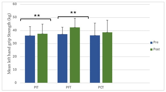 Left-hand grip strength demonstrated significant increases in two groups. PIT increased from 36.1 ± 6.9 kg to 37.6 ± 7.3 kg (4.2%, p = 0.009, dz = 1.05, large), and PFT increased from 37.3 ± 5.3 kg to 42.5 ± 6.9 kg (14.0%, p = 0.004, dz = 1.20, large), while PCT confirmed a non-significant improvement (Figure 5). No significant interaction between group and time was observed for left-hand gains (p = 0.062) (Figure 6).