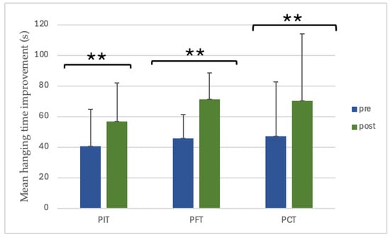 The value of pre- and post-training dead-hanging time. ** p < 0.01. (PIT = pull-up + interval training; PFT = pull-up + forearm training; PCT = pull-up + core training; s = seconds).