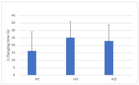 Between-group differences in dead-hanging time improvements. (PIT = pull-up + interval training; PFT = pull-up + forearm training; PCT = pull-up + core training; s = seconds; Δ = pre–post change).