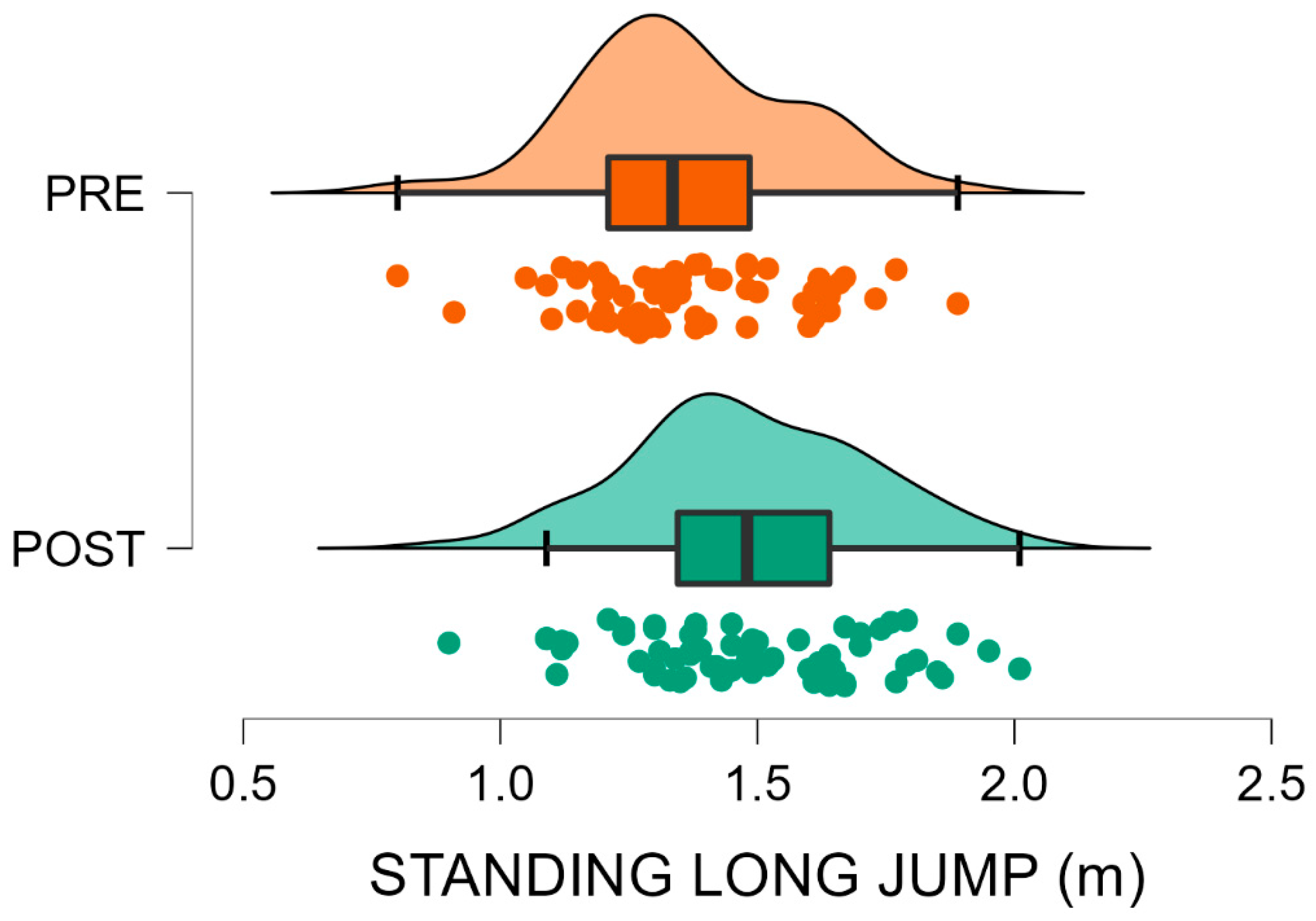 | Standing Long Jump (m) | 1.36 ± 0.21 | 1.52 ± 0.24 | +11.2% | <0.001 * |
