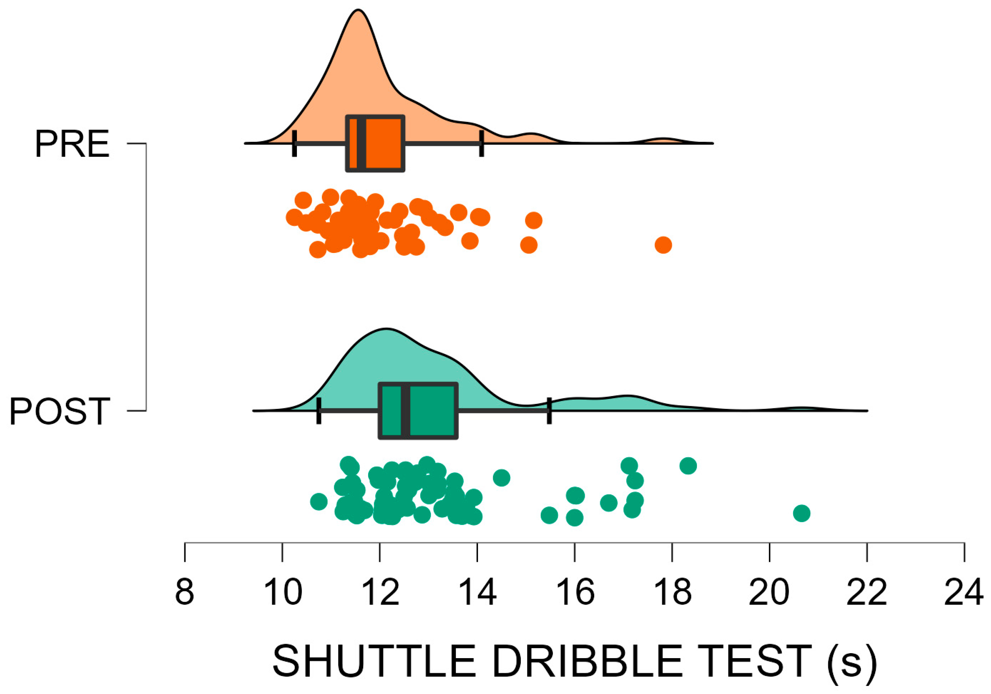 | Shuttle Dribble Test (s) | 12.03 ± 1.30 | 13.64 ± 2.74 | −13.4% (slower) | <0.001 * |