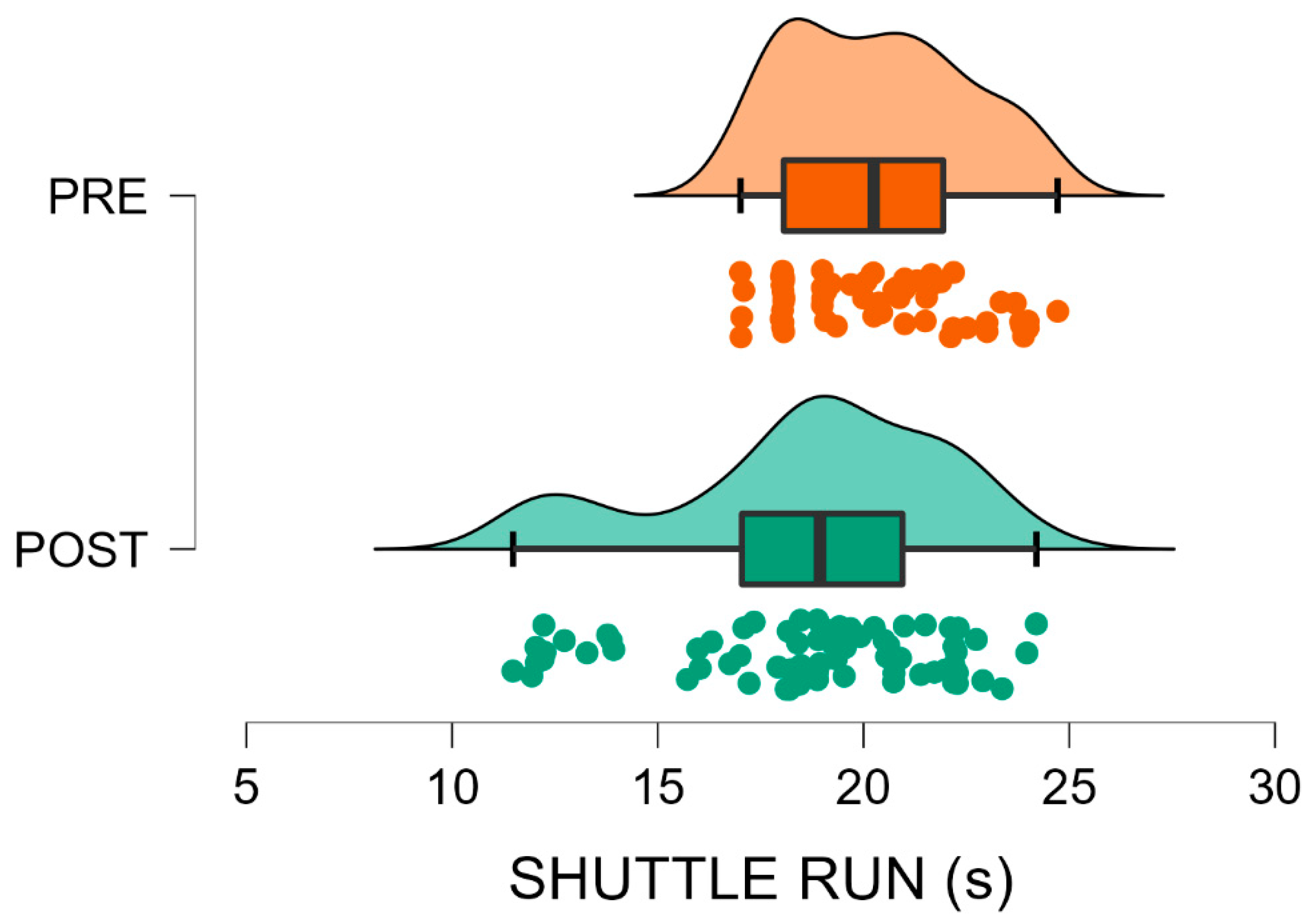 | Shuttle Run (s) | 20.33 ± 2.15 | 18.71 ± 3.12 | +8.0% (faster) | 0.011 * |