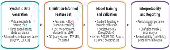 The first stage of the framework consisted of synthetic data generation, designed to emulate the structure and variability of athletic cohorts in a controlled digital environment. No experimental or human data were collected or analyzed; all datasets were generated synthetically within the simulation framework. Although no physical inertial sensors were used, the modeled segmental dynamics were structured to emulate IMU-level signal characteristics, ensuring translational compatibility with wearable-sensor data. This step combined virtual subjects with simulated running trials, introduced variability across three speed bands, and applied clinically anchored labeling rules based on H:Qdyn, LSI, and CCI. Together, these components define a digital cohort representative of athletic variability and imbalance patterns.