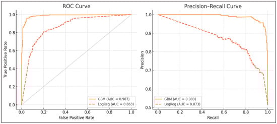 The ROC and PR curves are presented in Figure 2, showing clear separation between balanced and imbalanced cases and confirming the superior discrimination of Gradient Boosting compared with logistic regression.